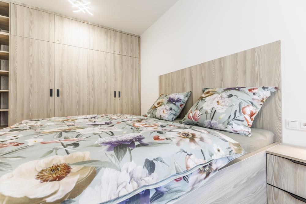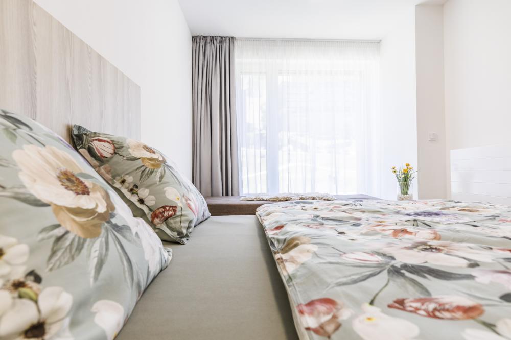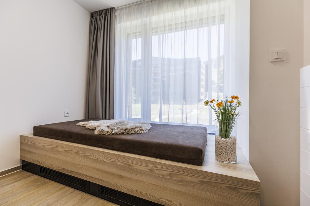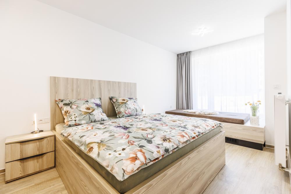 - Samostatnou ložnici s manželskou postelí, jednolůžkem s malebným výhledem na hory, které nabízí pohodlné místo pro odpočinek nebo nocleh pro dalšího hosta a vestavěnou skříní