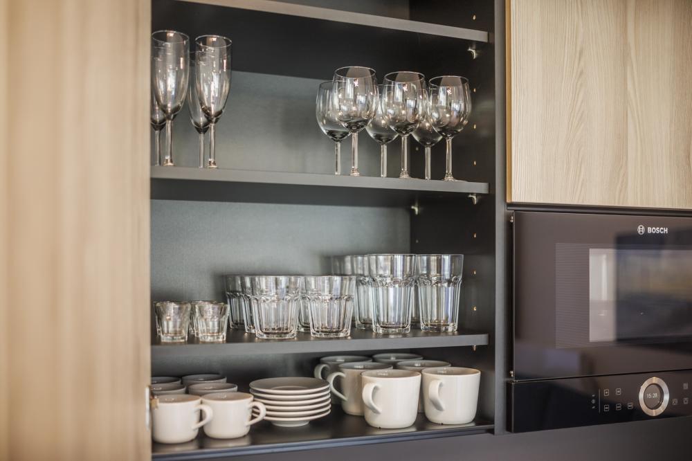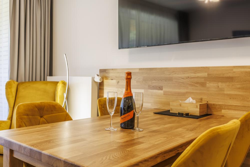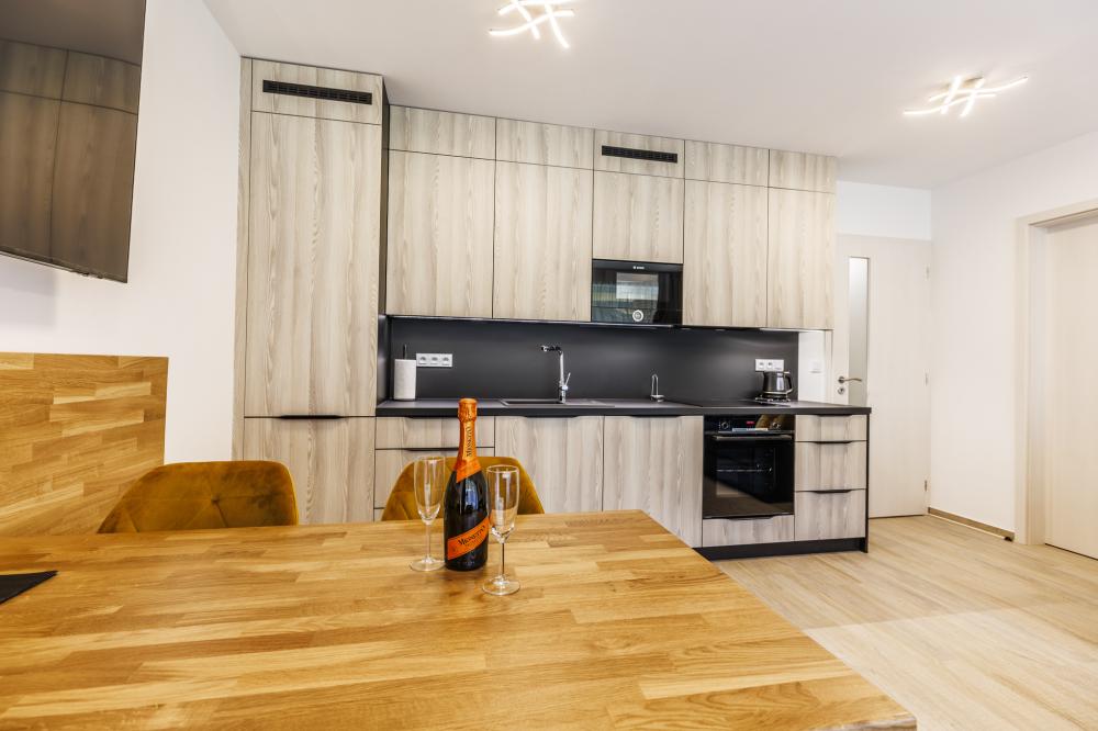 - Obývací pokoj nabízí komfortní posezení u jídelního stolu s jedinečným výhledem , plně vybavený kuchyňský kout s moderními spotřebiči (myčka, mikrovlnná trouba, kávovar), rozkládací sedací soupravu a pohodlné křeslo – ideální místo pro odpočinek